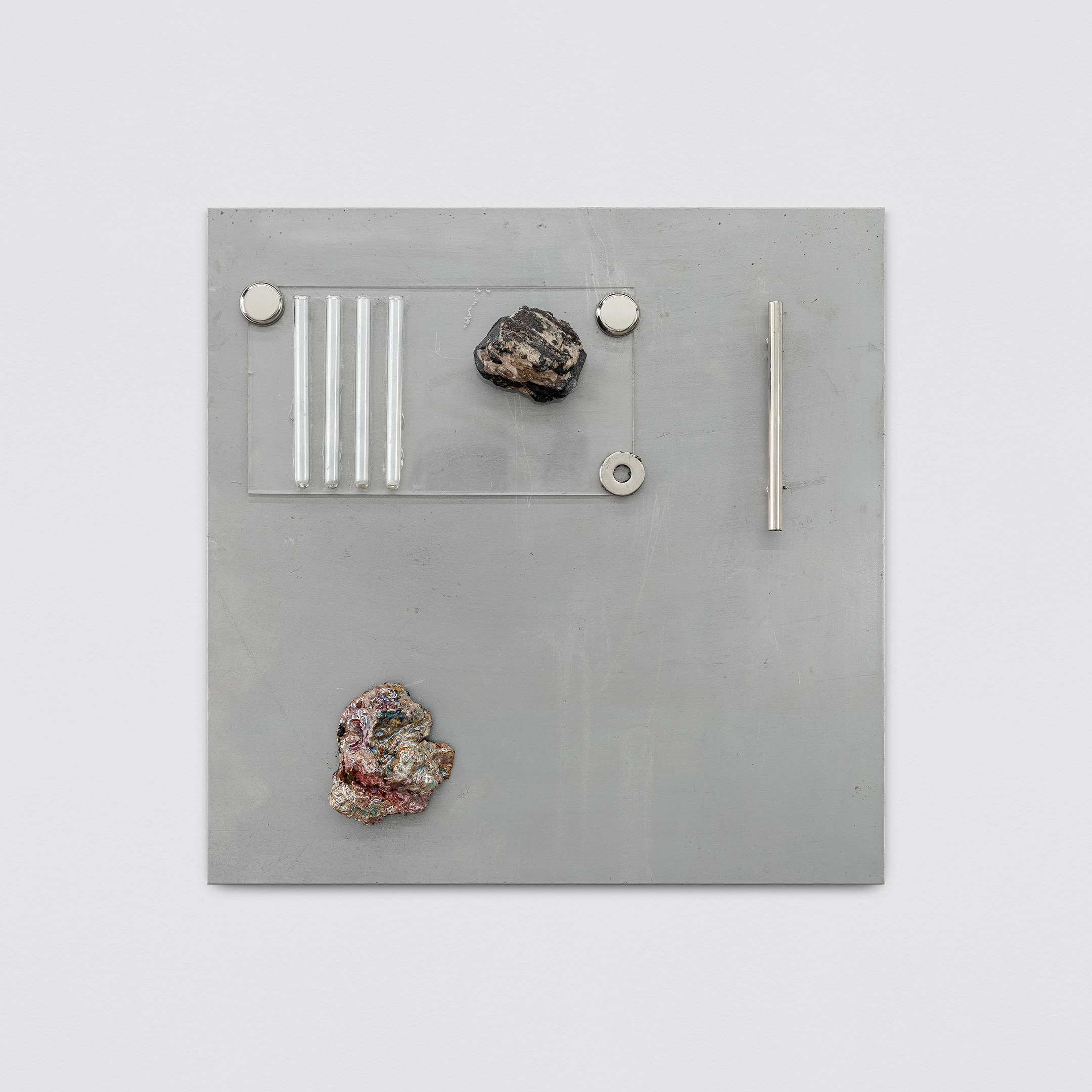 Chapa de aço, cerâmica paramagnética, imãs, barra de aço cromada, vidros de laboratório e pedra de magnetita.